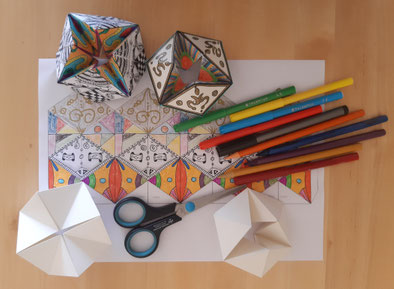 Meditativ zeichnen, farbig kolorieren und sich freuen über ein cleveres Papierspielzeug, welches immer wieder eine neue überraschende Seite zeigt.